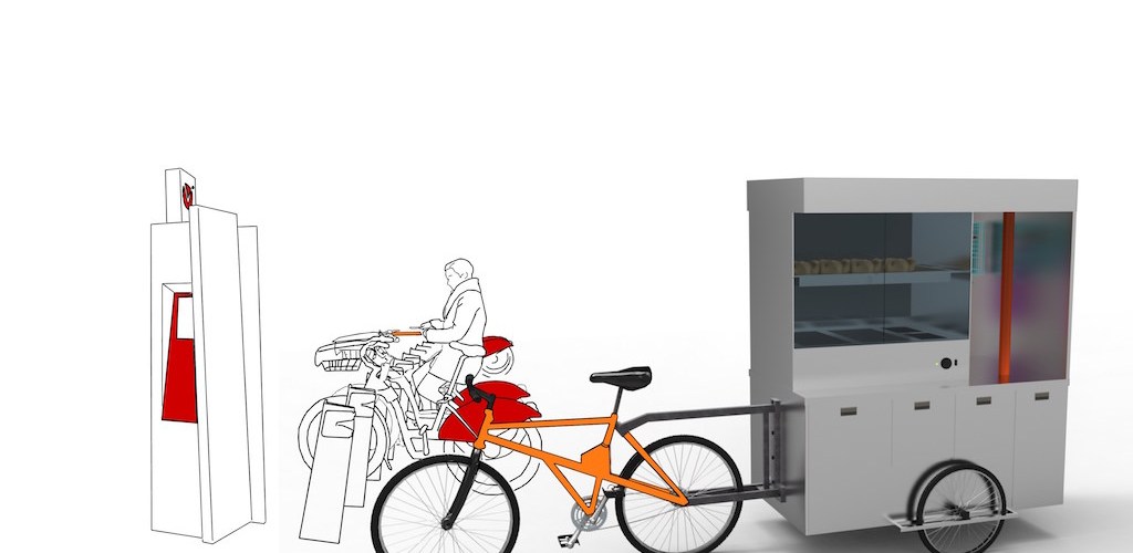 Roule Ma Poule est un projet de restauration ambulante, venant se greffer sur le réseau de vélos en libre service d’une ville. Un vélo tractant une remorque-cantine nous donne rendez-vous tous les jours à une station de vélos pour déguster du poulet rôti. On choisit un morceau puis on va s’installer avec son plateau sur l’un des vélos de la station fixé à sa borne.