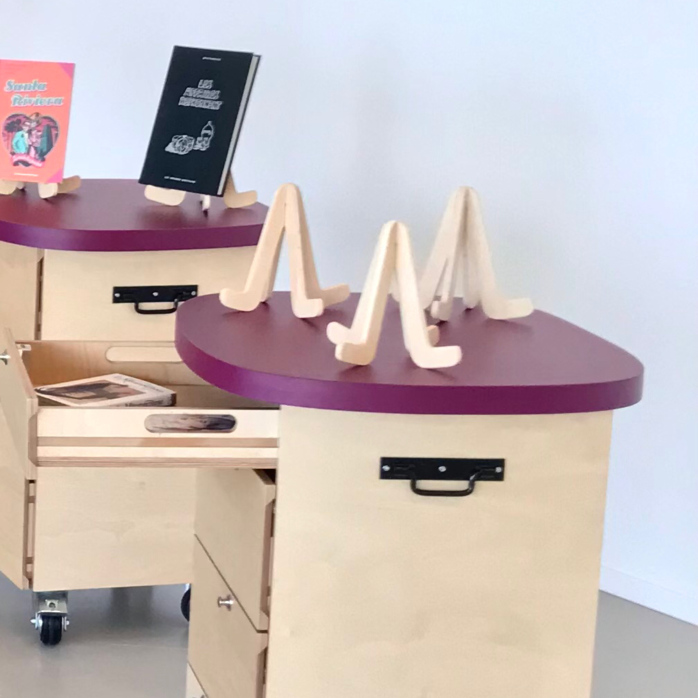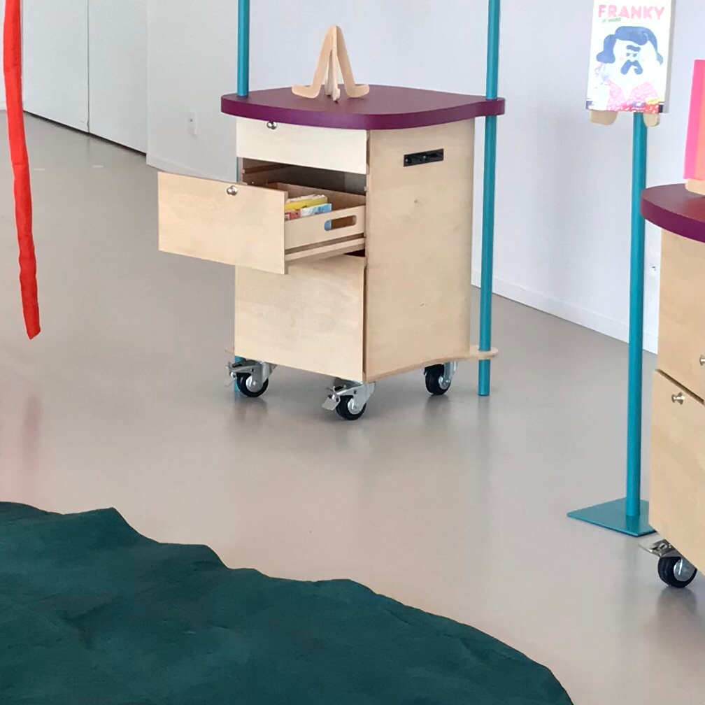 Le dispositif, contenant des fonds d’ouvrages thématiques choisis en concertation avec des professionnels et des élèves, naviguera de lycées en lycées en région Nouvelle-Aquitaine et sera support de découvertes littéraires et audiovisuelles, de création par le biais d’ateliers ou encore de rencontres avec des auteurs. Les intentions principales de ce projet sont la convivialité, la modularité, l’immersion, l’appropriation. Il est composé de 4 modules de livres ainsi que d’un module numérique, contenant des appareils permettant la création ou le visionnage de contenu audiovisuel. Des tapis et assises confectionnés à partir de toile de montgolfière revalorisée invitent à la détente et à s’installer confortablement. Enfin, l’installation tubulaire forme un pare-vue pour délimiter l’espace du dispositif et sert également de système de monstration des ouvrages. La conception participative de ce projet a été entamée en octobre 2021, avec les élèves de 1ère STD2A des établissements Magendie à Bordeaux, Loewy à La Souterraine et Coulomb à Angoulême. Durant 3 séances, nous avons échangé sur les usages induits du dispositif, dessiné et maquetté des pistes et affiné le cahier des charges.