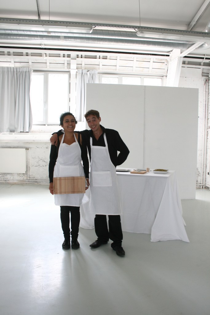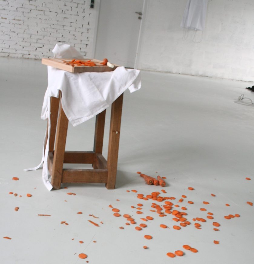 Enfiler le tablier. S’asseoir. A l’aide du couteau, couper les carottes en rondelles sur la planche. Quand il n’y a plus de place sur la planche, tenter de transporter les carottes coupées jusqu’à la table du cuisinier sans les mains. Échouer. Recommencer.