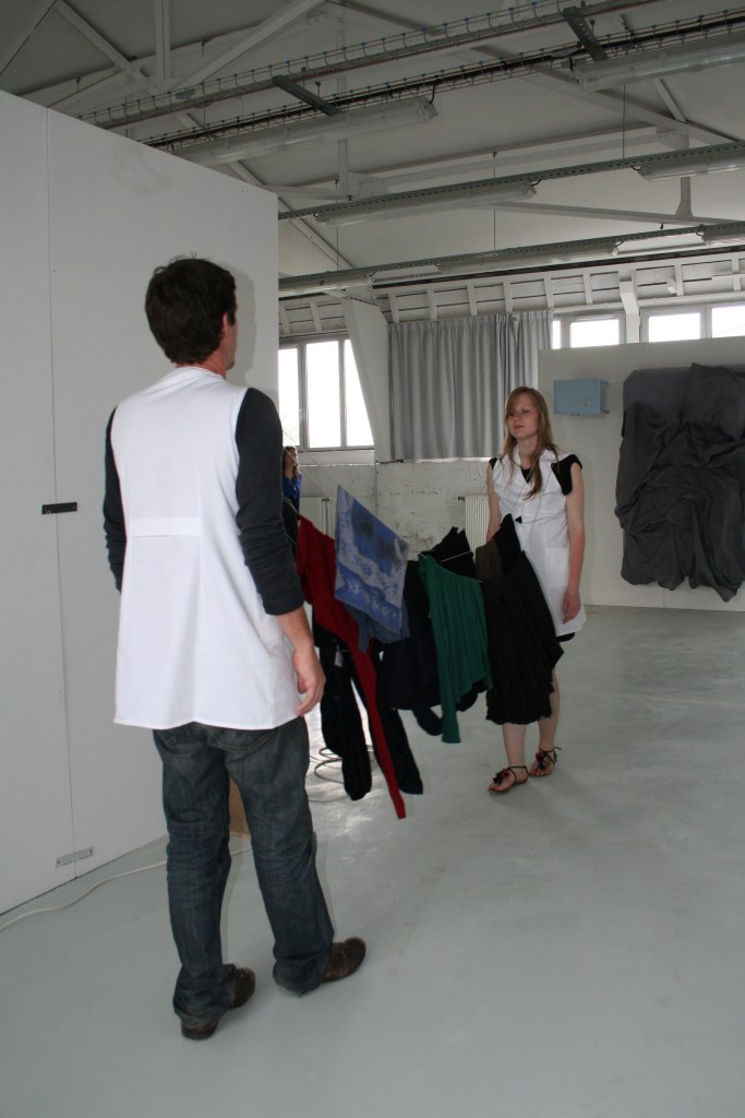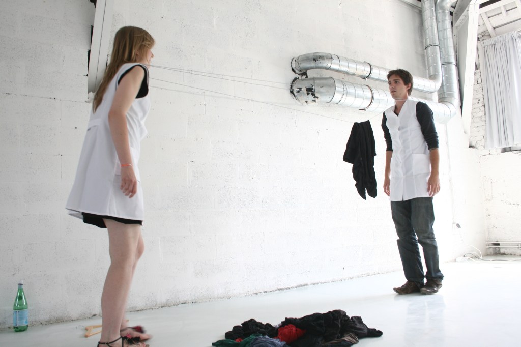 Vêtements à performer : le fil à linge, deux blouses reliées par des fils à linge au niveau des épaules. Pour deux personnes.