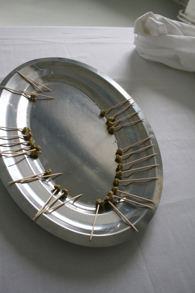 Ouvrir une boîte de conserve de petits pois. Pratiquer sur chacun des petits pois une incision dans leur tiers supérieur. Puis, un par un, les évider de leur contenu. Préparer la farce (cette étape aura pu être réalisée préalablement) : mélanger fromage de chèvre frais, menthe ciselée, sel et poivre. Insérer cette farce dans les petits pois. Servir tel quel. Ou sur un plateau. Cacher la boîte de conserve.