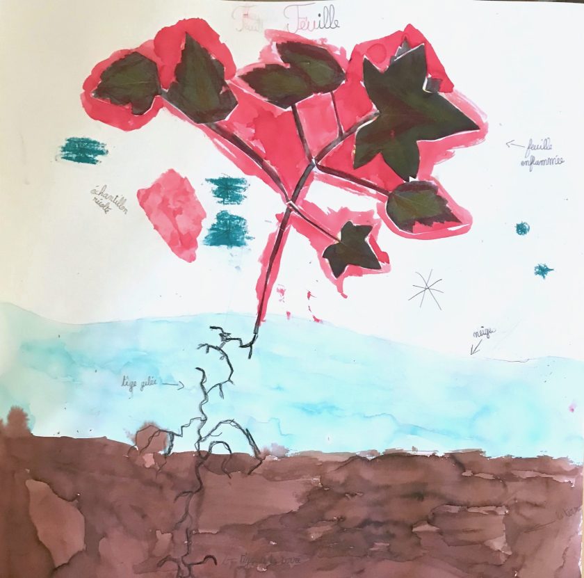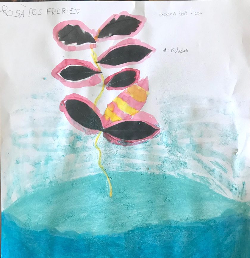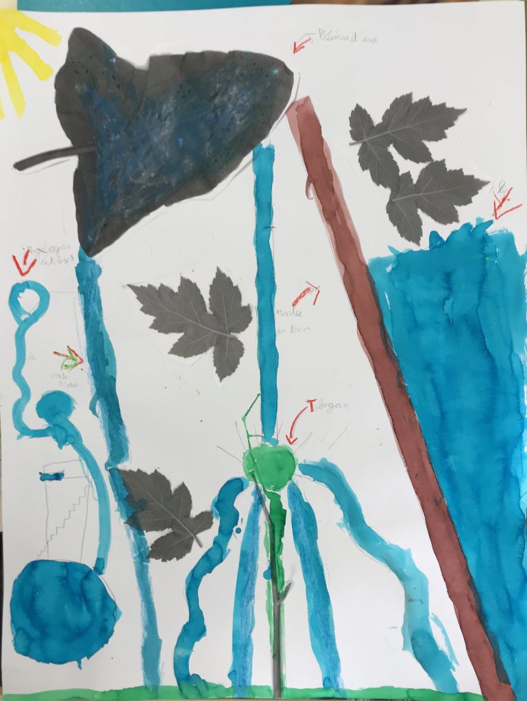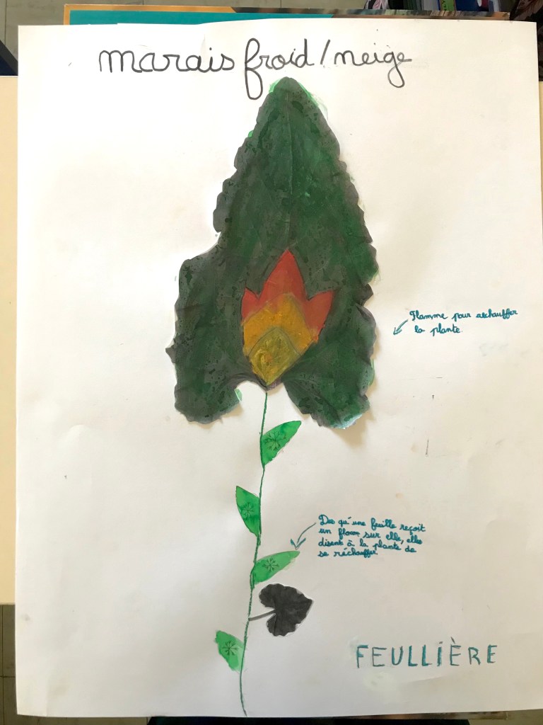 Ici, je propose aux élèves de CM1 et CM2 de l’école Les Hirondelles de Magné de découvrir les plantes de leur environnement, puis d’en imaginer pour le futur, avec de super-pouvoirs. Lors une sortie botanique d’étude des variétés locales du marais poitevin, les élèves ont prélevé des feuilles dans le but de réaliser un herbier. À partir de photocopies des spécimens collectés, nous avons imaginé et réalisé des montages et dessins de nouvelles plantes, en choisissant une des contraintes créatives suivantes : Les plantes et arbres grandissent, se reproduisent, se multiplient, communiquent même ! Elles s’adaptent et interagissent avec leur milieu. Et si le marais poitevin était submergé par l’eau ? S’il devenait aride ? S’il devenait exclusivement dédié à servir l’humain ? Ou les animaux ?
