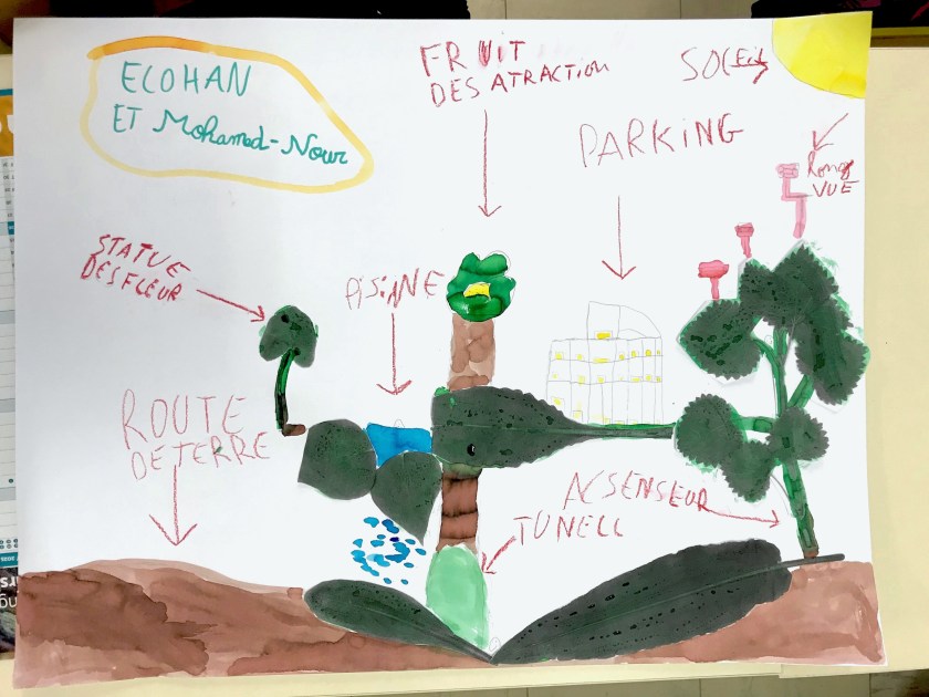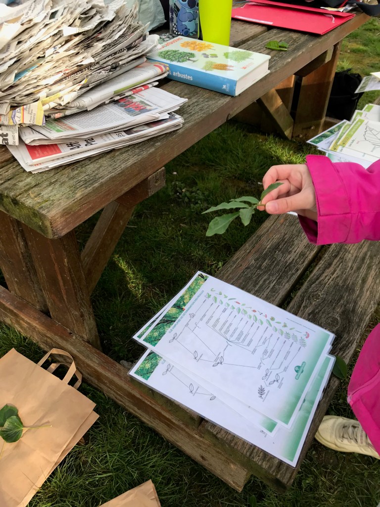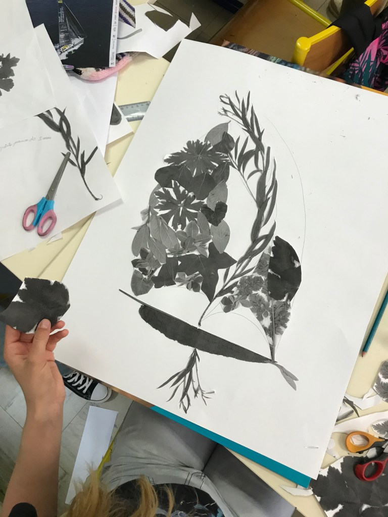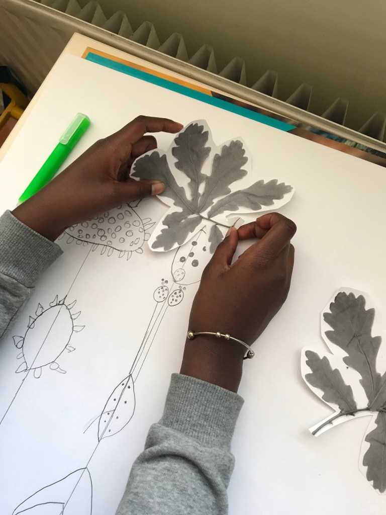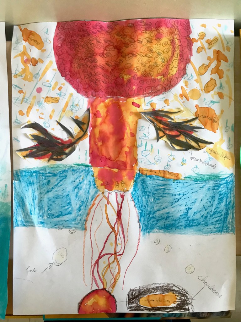 Ici, je propose aux élèves de CM1 et CM2 de l’école Les Hirondelles de Magné de découvrir les plantes de leur environnement, puis d’en imaginer pour le futur, avec de super-pouvoirs. Lors une sortie botanique d’étude des variétés locales du marais poitevin, les élèves ont prélevé des feuilles dans le but de réaliser un herbier. À partir de photocopies des spécimens collectés, nous avons imaginé et réalisé des montages et dessins de nouvelles plantes, en choisissant une des contraintes créatives suivantes : Les plantes et arbres grandissent, se reproduisent, se multiplient, communiquent même ! Elles s’adaptent et interagissent avec leur milieu. Et si le marais poitevin était submergé par l’eau ? S’il devenait aride ? S’il devenait exclusivement dédié à servir l’humain ? Ou les animaux ?