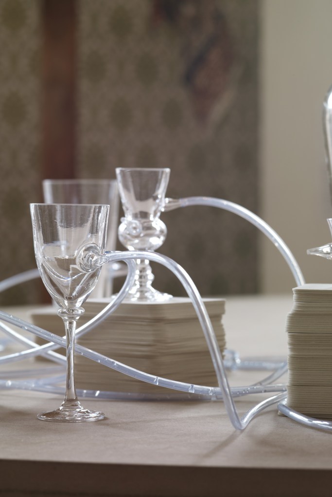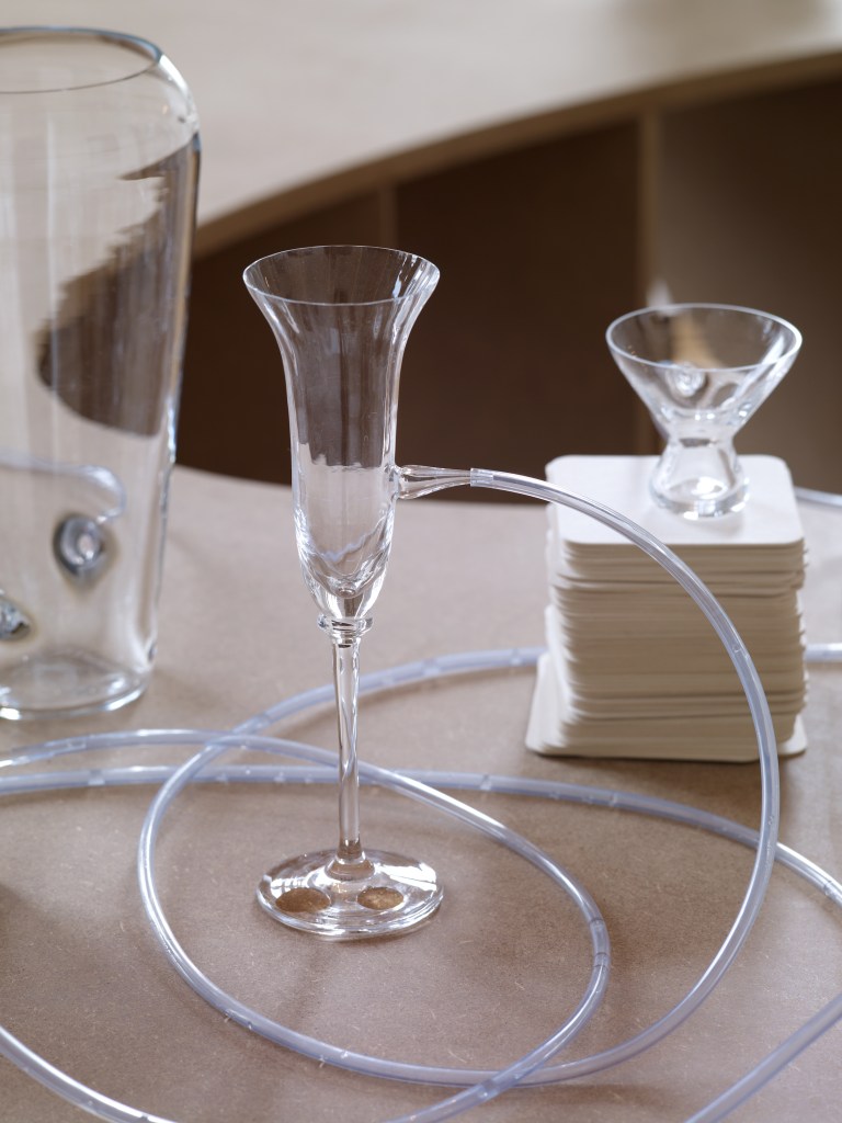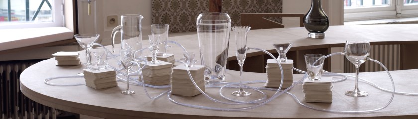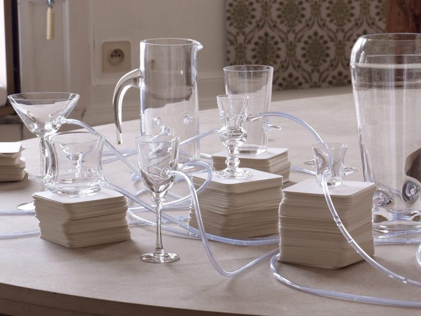 Les verres communicants réinventent un acte quotidien simple et éminemment sociabilisant : boire un verre ensemble. L’ensemble est composé de douze verres hétérogènes, d’une carafe et d’un réservoir, ainsi que de douze bouchons-gouttes. Chaque pièce du service est reliée à au moins une autre des pièces par l’intermédiaire de tubes souples. L’ensemble contraint les gestes des utilisateurs, transforme un geste ordinaire et individuel en un geste collectif et extra-ordinaire.